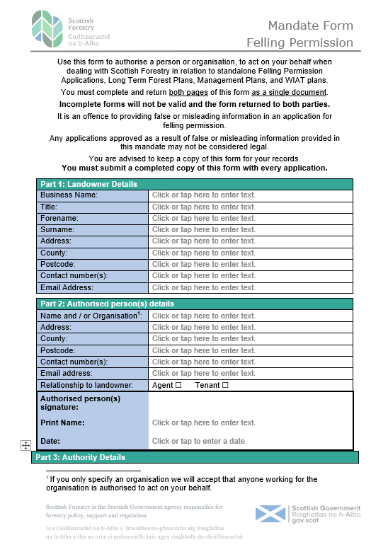 Use this form to provide your agent or representative with authority to act on your behalf when dealing with Scottish Forestry in relation to the submission and management of Felling Permissions.