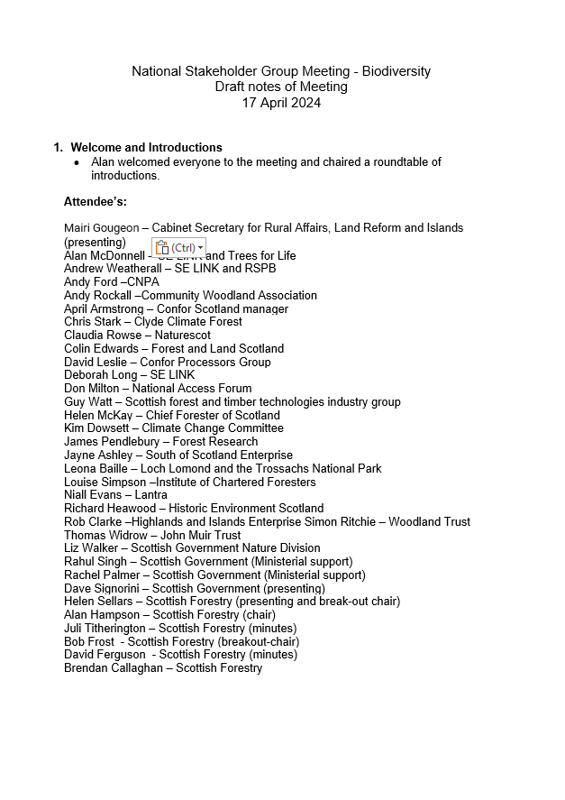 Draft notes of the National Stakeholder Group Meeting - Biodiversity, from 17 April 2024.