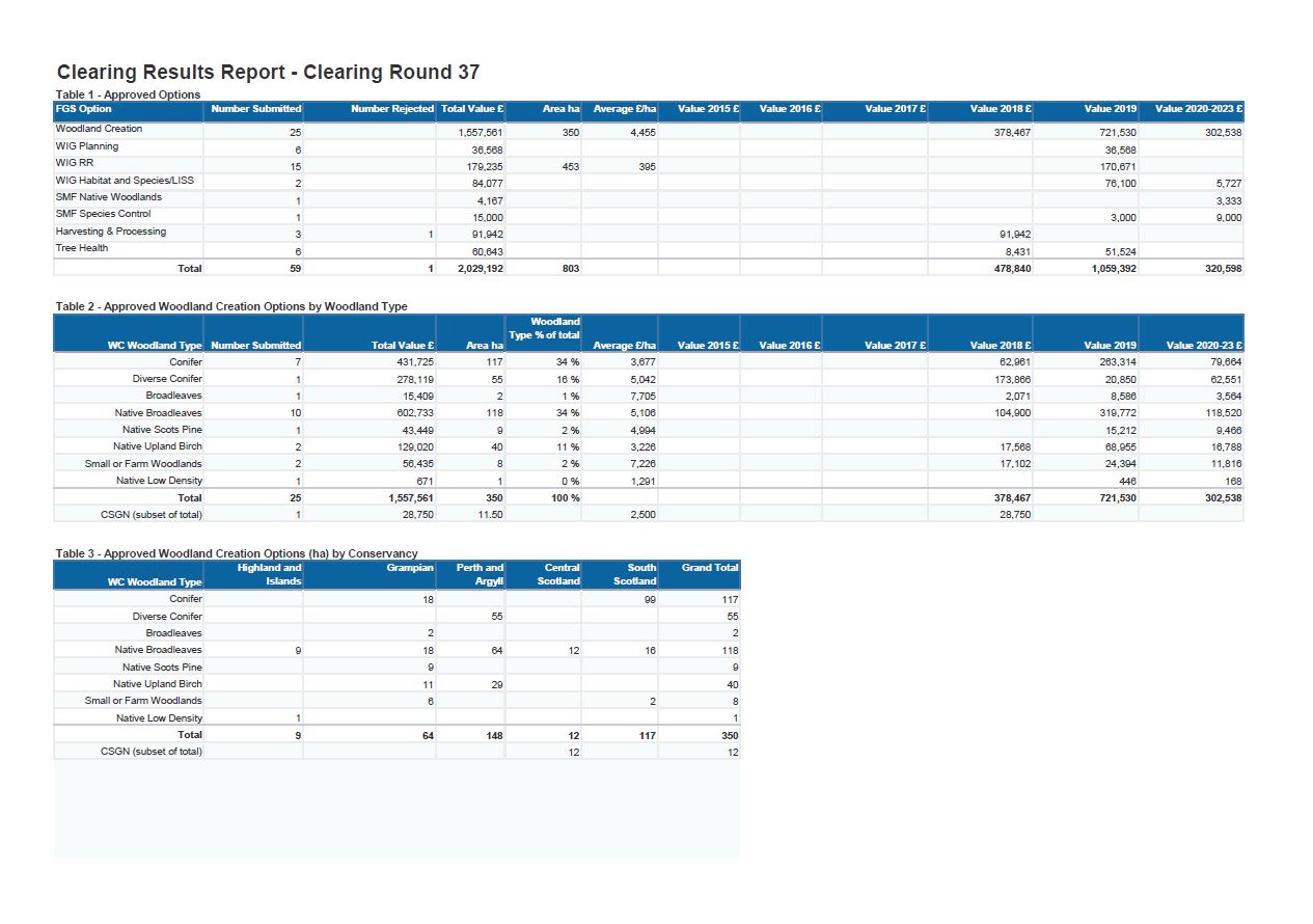 Approved options, approved woodland creation options by woodland type and approved woodland creation options by Conservancy are shown.