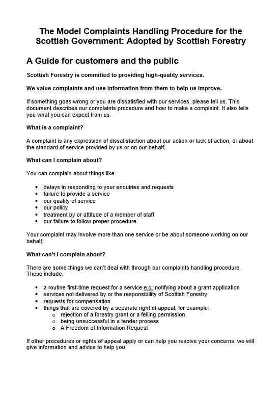 The Model Complaints Handling Procedure for Scottish Forestry - updated 19-04-24