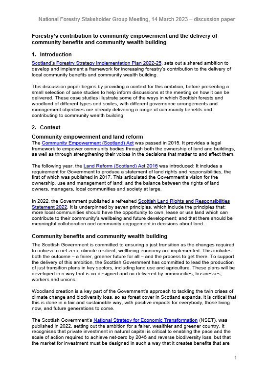 National Forestry Stakeholder Group discussion paper - Delivering local community benefits and wealth building - 14 March 2023