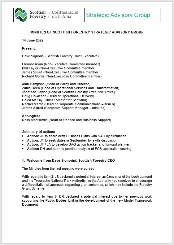 The minutes of the Scottish Forestry Strategic Advisory Group (SAG) for 14 June 2022. Matters discussed: