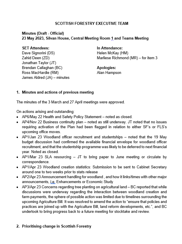 Scottish Forestry Executive Team (SFET) minutes for 23 May 2023.