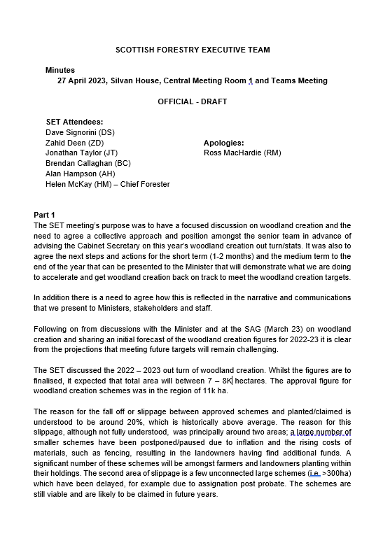 Scottish Forestry Executive Team (SFET) minutes for 27 April 2023.