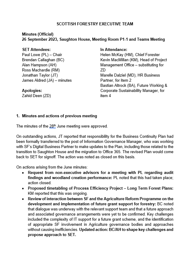 Scottish Forestry Executive Team (SFET) minutes for 26 September 2023.