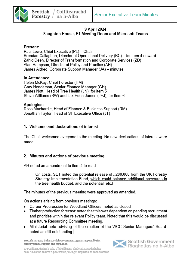 Scottish Forestry Executive Team (SFET) minutes for 9 April 2024.