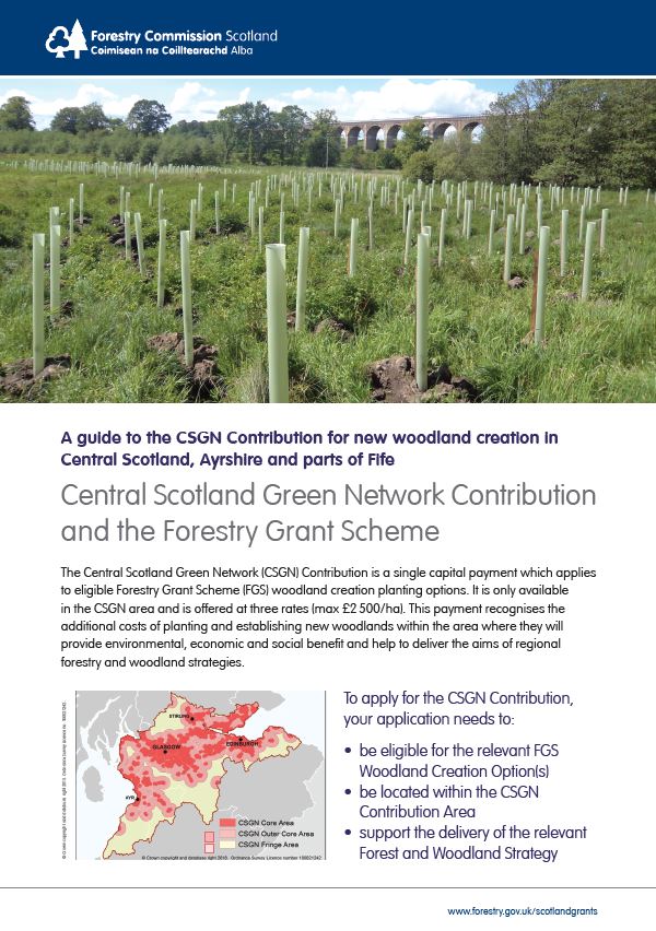 The Central Scotland Green Network (CSGN) Contribution is a single capital payment which applies to eligible Forestry Grant Scheme (FGS) woodland creation planting options. It is only available in the CSGN area and is offered at three rates (max £2 500/ha). This payment recognises the additional costs of planting and establishing new woodlands within the area where they will provide environmental, economic and social benefit and help to deliver the aims of regional forestry and woodland strategies.