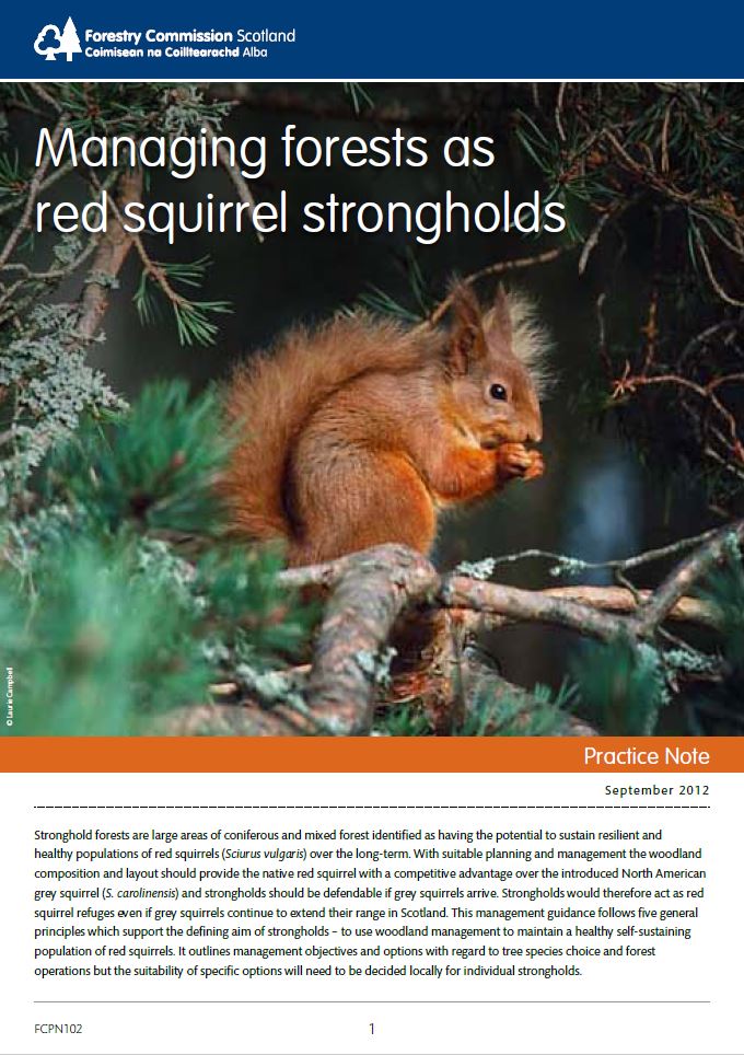 Stronghold forests are large areas of coniferous and mixed forest identified as having the potential to sustain resilient and healthy populations of red squirrels (Sciurus vulgaris) over the long-term. With suitable planning and management the woodland composition and layout should provide the native red squirrel with a competitive advantage over the introduced North American grey squirrel (S. carolinensis) and strongholds should be defendable if grey squirrels arrive. Strongholds would therefore act as red squirrel refuges even if grey squirrels continue to extend their range in Scotland. This management guidance follows five general principles which support the defining aim of strongholds – to use woodland management to maintain a healthy self-sustaining population of red squirrels. It outlines management objectives and options with regard to tree species choice and forest operations but the suitability of specific options will need to be decided locally for individual strongholds.