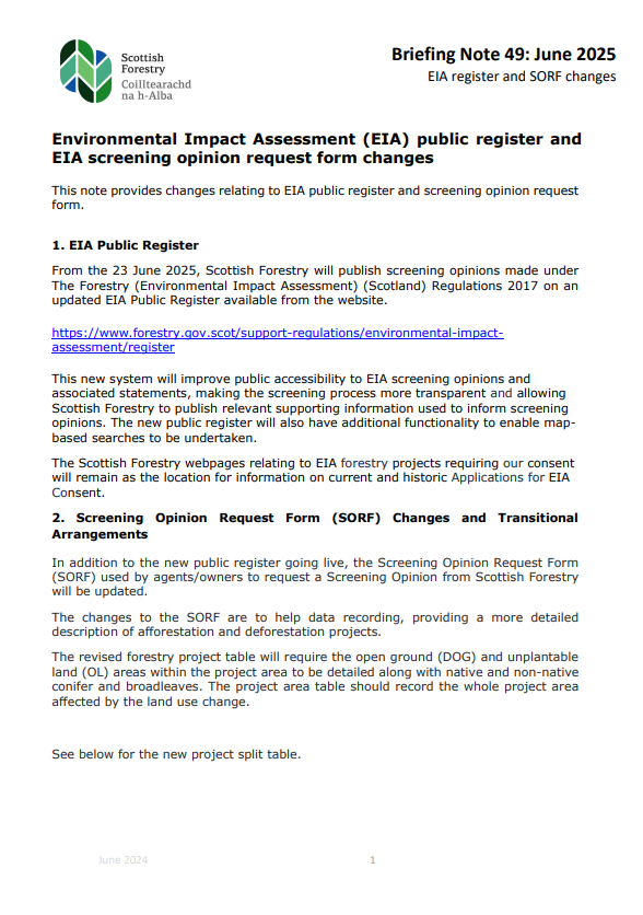 From the 23 June 2025, Scottish Forestry will publish screening opinions made under The Forestry (Environmental Impact Assessment) (Scotland) Regulations 2017 on an updated EIA Public Register available from the website.