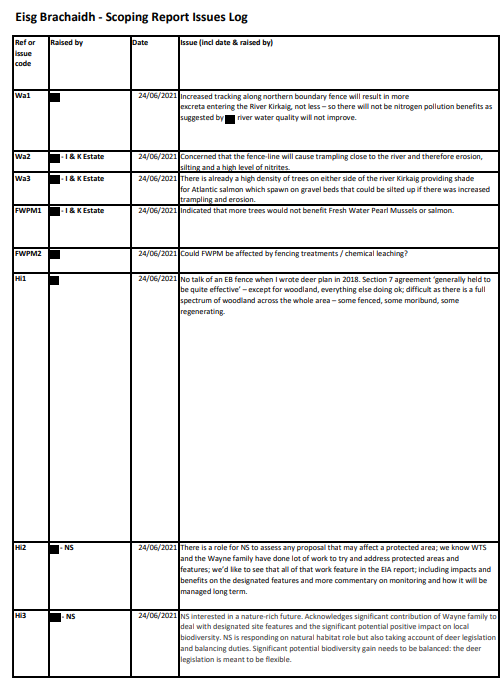 EIA Issues Log for Scoping Report for proposed afforestation at Eisg Brachaidh Estate, by Ullapool.