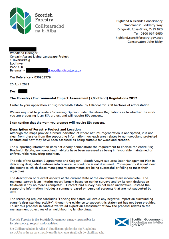 EIA Screening Opinion for proposed afforestation at Eisg Brachaidh Estate, by Ullapool.