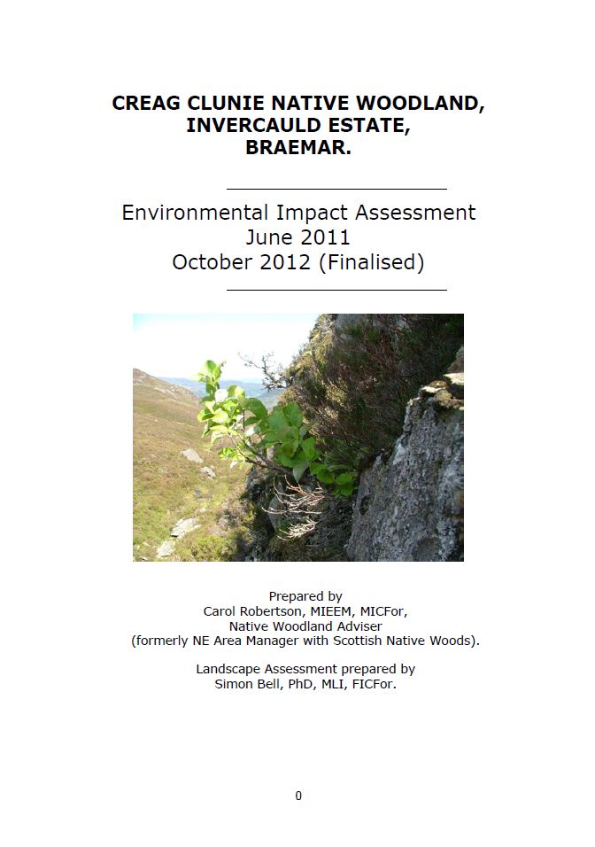 This Environmental Impact Assessment identifies the main affects of creating a large area of new native woodland on Invercauld Estate. It also makes management recommendations to ensure that the proposals will not harm the current interests on the site.