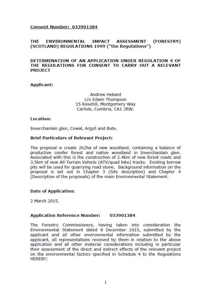 Consent decision schedule for Inverchaolain Glen. Part one of two.