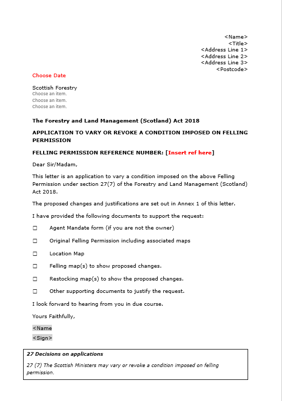 Template letter and form for an application to revise felling permission conditions (updated October 2023).