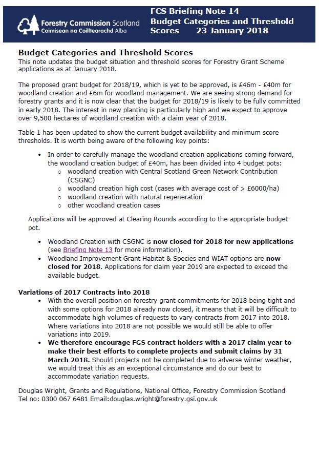 This briefing note updates the budget situation and threshold scores for Forestry Grant Scheme applications as at January 2018.