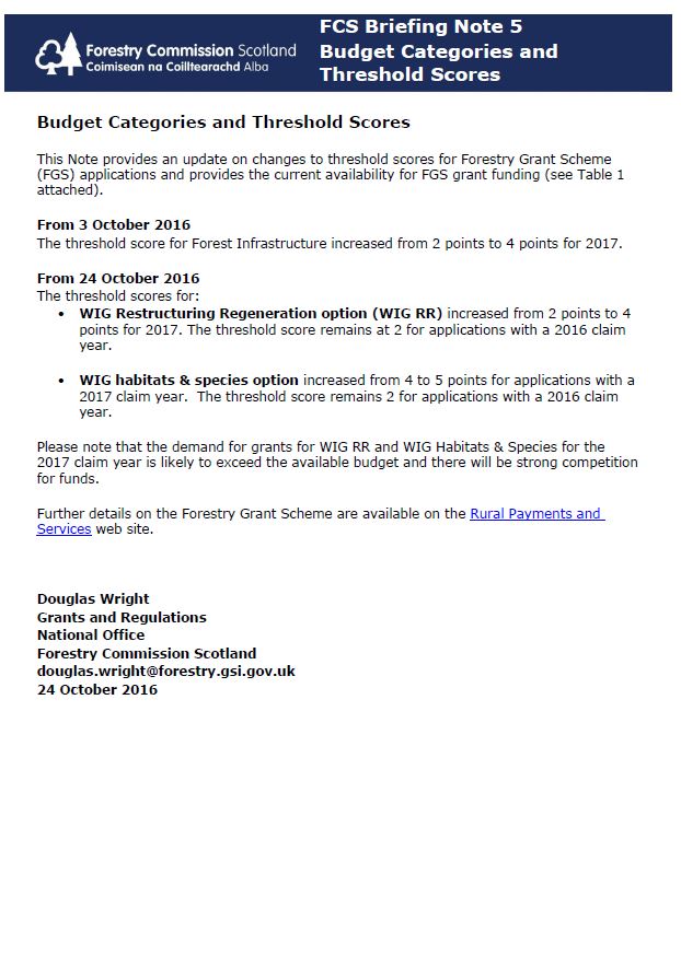 This briefing note provides an update on changes to threshold scores for Forestry Grant Scheme (FGS) applications and provides the current availability for FGS grant funding.