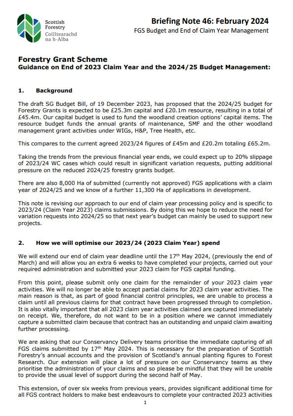 This briefing note (February 2024) provides information on the Forestry Grant Scheme Budget and end of Claim year Management.
