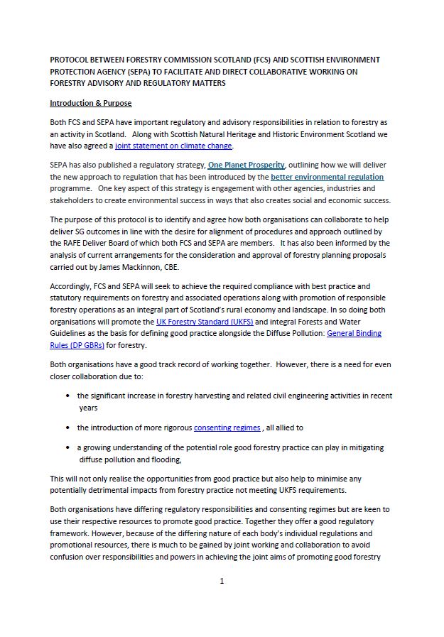 The purpose of this protocol is to identify and agree how both organisations can collaborate to help deliver SG outcomes in line with the desire for alignment of procedures and approach outlined by the RAFE Deliver Board of which both SF and SEPA are members. It has also been informed by the analysis of current arrangements for the consideration and approval of forestry planning proposals carried out by James Mackinnon, CBE.