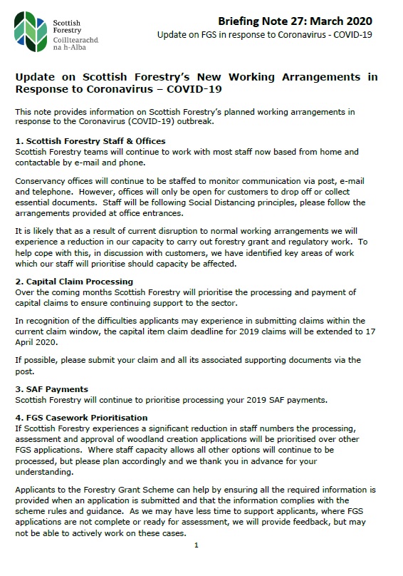 This Briefing Note provides information on Scottish Forestry’s new working arrangements in response to the coronavirus - COVID-19, as at 20 March 2020.