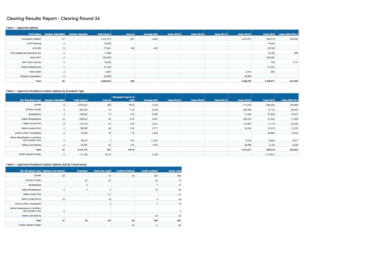 Approved options, approved woodland creation options by woodland type and approved woodland creation options by Conservancy are shown.
