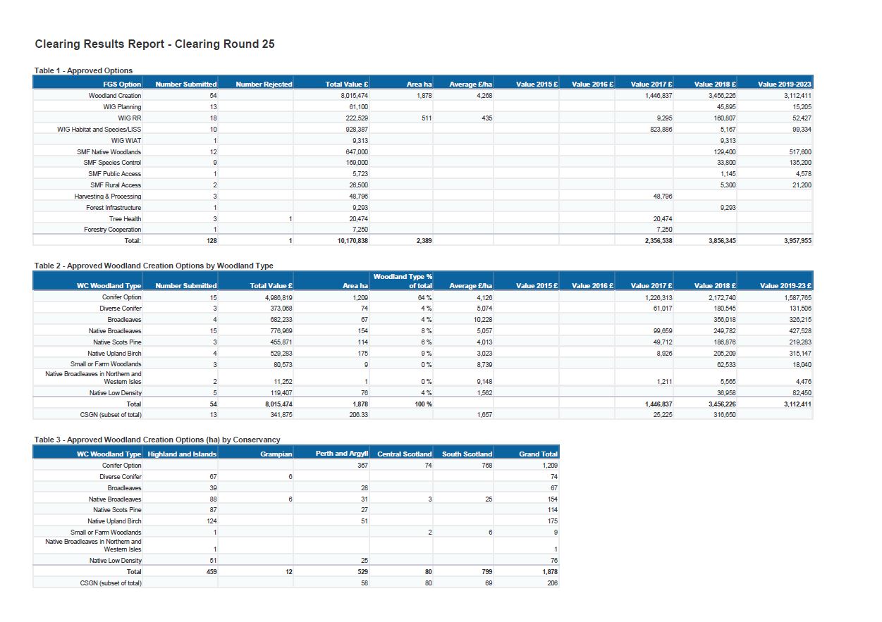 Approved options, approved woodland creation options by woodland type and approved woodland creation options by Conservancy are shown.