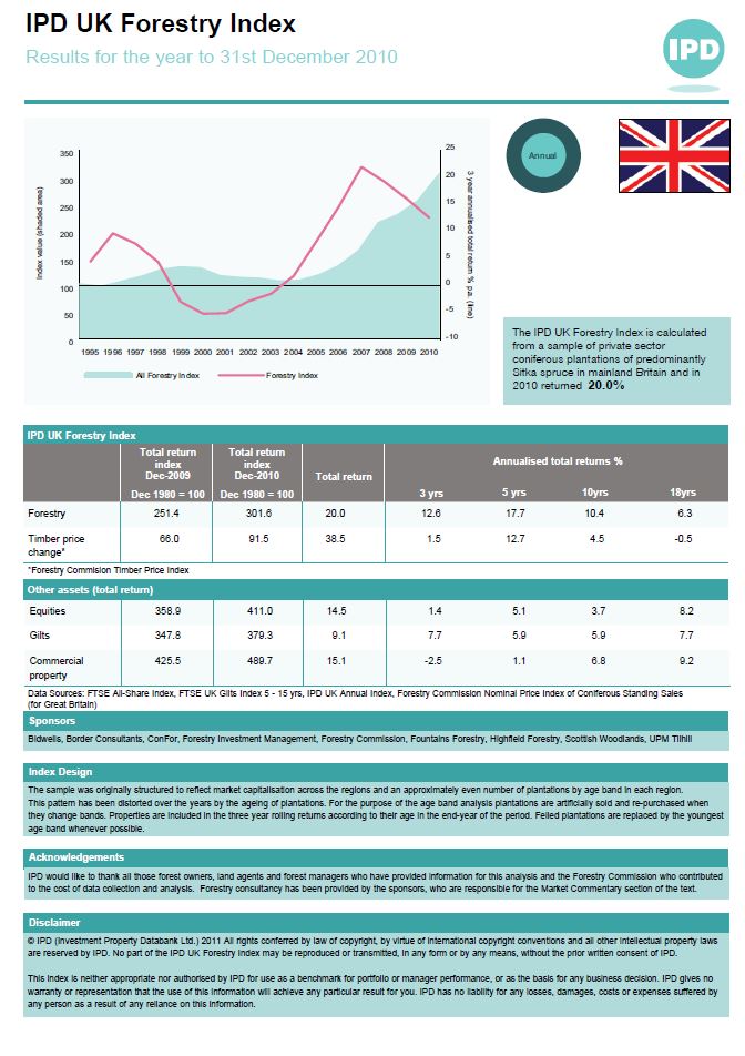 The IPD Forestry Index is calculated from a sample of private sector coniferous plantations of predominantly Sitka spruce in mainland Britain.