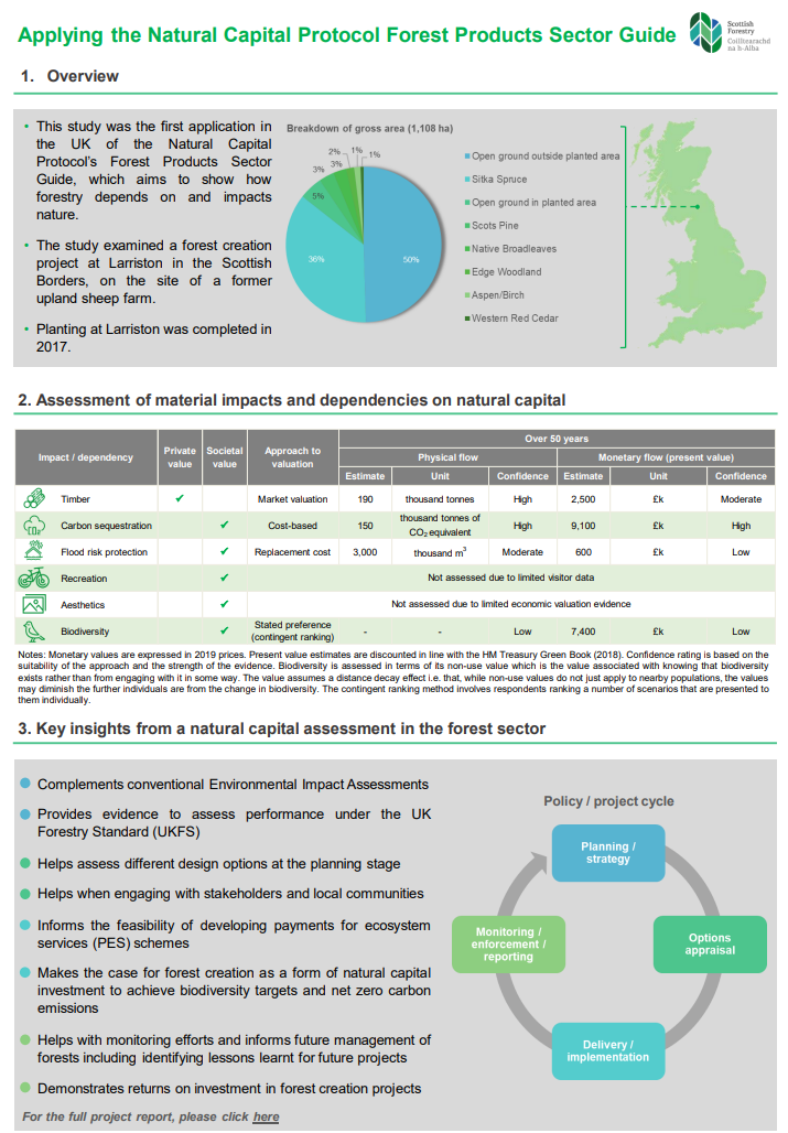 This infographic presents the first application in the UK of the Forest Sector Guide under the Natural Capital Protocol. It aims to highlight the inter-dependence between the economy and wider social and environmental goals, demonstrating the role of woodland creation in supporting the economy through timber production as well as providing wider benefits for communities and nature.
